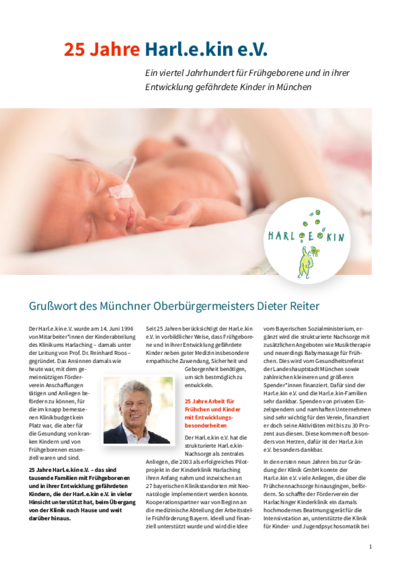"1996 bis 2021, das sind 25 Jahre erfolgreiche Vereinsarbeit, das sind Generationen von Frühchenfamilien und anderen in ihrer Entwicklung gefährdeten Kindern, um die sich die Mitarbeiter*innen des Harl.e.kin e.V. mit viel Engagement und Sachverstand gekümmert haben. Das wird auch in Zukunft so sein, da bin ich mir sicher, und dafür danke ich allen engagierten Mitarbeiter*innen und dem ehrenamtlichen Vorstand von Herzen. Besonders erwähnt sei Prof. Dr. Reinhard Roos, der für sein herausragendes Engagement für Neonatologie und Nachsorge bereits 2019 die Medaille „München leuchtet – den Freundinnen und Freunden Münchens“ in Silber erhalten hat. Natürlich auch der aktuell amtierende Vorstand rund um Herrn Dr. Armin Gehrmann und Frau Dr. Andrea Zimmermann, der die Geschicke des Harl.e.kin e.V. mit hohem Sachverstand und viel Gespür lenkt, sich um die perinatal belasteten Familien kümmert und die Harl.e.kin-Teams an den Münchner Kinderkliniken zusammenhält. Das ist gerade jetzt in der schwierigen Sars-Covid19-Pandemie von unschätzbarem Wert." betont der Münchner Oberbürgermeister Dieter Reiter: "Sehr gerne habe ich schon im Jahr 2015 die Schirmherrschaft für den Harl.e.kin e.V. übernommen und wünsche dem Harl.e.kin e.V. als dem Förderverein für Frühchen in München weiter eine erfolgreiche Arbeit."