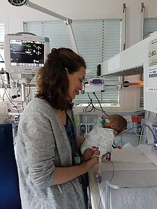 „Wir haben unseren Sohn Noah Simon am 4.7.2019 in der 25. Schwangerschaftswoche nach einer komplikationsreichen Schwangerschaft bekommen. Er hatte eigentlich einen kleinen Zwillingsbruder, der durch die Plazenta nicht richtig ernährt werden konnte. Deshalb haben wir ihn schon ganz früh verloren. Noah hatte ein Loch in der Fruchtblase, es ging auch immer wieder Fruchtwasser ab, bis die Ärzte in der Klinik Harlaching ihn per Kaiserschnitt geholt haben. Danach hatten wir lange Wochen und insgesamt fünf Monate auf der Intensivstation, mit vielen Ängsten und großer Unsicherheit, was kommen wird. Man konnte da nur von Tag zu Tag denken. Noah hatte eine schwere Komplikation durch die Frühgeburtlichkeit in seiner 2. Lebenswoche und musste mehrmals am Darm operiert werden. Wir wussten zeitweise nicht, ob er dies überleben wird. Dank des tollen Teams der Intensivstation hatten wir viel Halt und unglaubliche Unterstützung, ich hab dort jeden Tag viele Stunden mit Noah verbracht - es war wie ein Familien-Ersatz für uns.